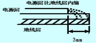 對于高速數(shù)字電路板應該采用多層板, 以減小環(huán)路面積, 將中間層作為電源或地層, 并且盡量保證電源與地相鄰的層間距盡量小;讓每一信號層都有一對應的地線層, 信號線與其地回路構成的環(huán)面積要盡可能小, 環(huán)面積越小, 對外的干擾越少。針對這一特點, 在地平面分割時, 要考慮到地平面與重要信號走線的分布, 防止由于地平面開槽等帶來的問題,信號線不能跨越地平面和電源平面分隔區(qū), 防止形成大的地線回路。同時電源層應該比地線層內(nèi)縮3 m m 左右的距離, 這樣將能夠抑制70% 以上的電源干擾。如圖2 所示。