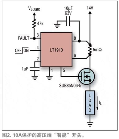 自從功率MOSFET器件推出以來,設(shè)計(jì)師們一直將它們視作繼電器的潛在替代產(chǎn)品。現(xiàn)代N-MOSFET開關(guān)的導(dǎo)通電阻值在一位數(shù)毫歐姆范圍內(nèi),允許使用沒有笨拙散熱結(jié)構(gòu)的標(biāo)準(zhǔn)表面貼裝技術(shù)。目前已經(jīng)開發(fā)出了低價(jià)集成電路解決方案,這種方案可提供自含式升壓柵極驅(qū)動(dòng)功能。這些電路還采用了快速故障保護(hù)機(jī)制,這樣MOSFET就永遠(yuǎn)不會(huì)有出現(xiàn)故障的風(fēng)險(xiǎn)。凌力爾特公司的LT1910就是這樣的“智能開關(guān)”控制集成電路,該器件利用低阻值高壓端電流檢測(cè)電阻(類似圖1(c))檢測(cè)電路過載,并在發(fā)生損害之前關(guān)斷正在工作的MOSFET。該集成電路一檢測(cè)到過載情況,就設(shè)置一個(gè)警告標(biāo)記,并周期性地嘗試重新啟動(dòng)該負(fù)載,直到故障清除為止。盡管這個(gè)集成電路本質(zhì)上只是二進(jìn)制,但是就用電流檢測(cè)形成如圖2所示的堅(jiān)固“閉環(huán)”電子繼電器解決方案而言,這是一個(gè)不錯(cuò)的實(shí)例。