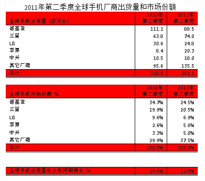 日前,據(jù)Strategy Analytics最新研究顯示,2011年二季度全球手機出貨量比去年同期增長13%,達(dá)到3.611億臺。諾基亞出現(xiàn)自1999年以來最大下滑,而蘋果已經(jīng)接近排名第三的LG。
