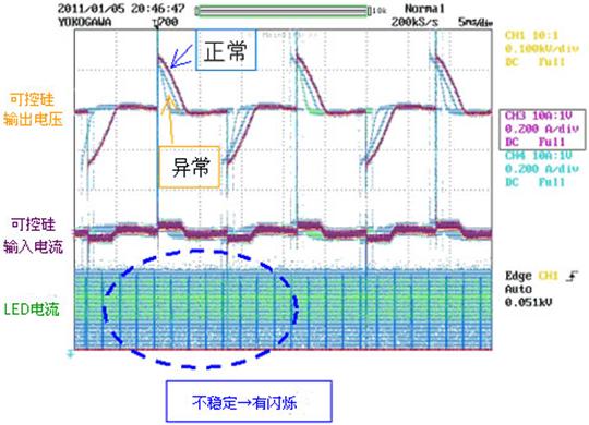 可控硅調(diào)光器在可控硅處于導(dǎo)通狀態(tài)時(shí)必須使保持電流持續(xù)流通;一旦保持電流下降,可控硅便關(guān)斷了。由于LED照明燈與原有照明燈相比,功耗極低,所以使可控硅的保持電流下降,調(diào)光器就往往會因此而不定期關(guān)斷從而發(fā)生閃變(閃爍)現(xiàn)象。(圖5)