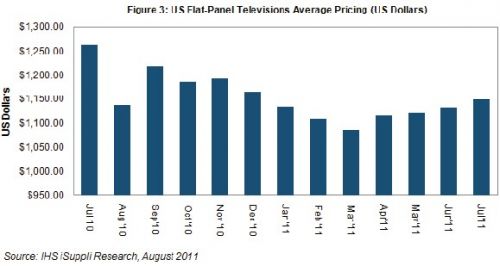 高檔品牌與價(jià)值品牌在同樣的市場(chǎng)環(huán)境中激烈競(jìng)爭(zhēng)。IHS iSuppli公司的研究顯示,7月美國(guó)平板電視價(jià)格連續(xù)第四個(gè)月環(huán)比上漲。平均銷(xiāo)售價(jià)格為1150美元,比6月上升1.5%,但比2010年7月下滑9%,如圖所示。尤其是,今年上半年推出的新型號(hào)銷(xiāo)售增長(zhǎng),在市場(chǎng)疲弱之際幫助支撐了需求。零售商也報(bào)告稱(chēng),由于價(jià)格較低,32英寸及更小尺寸的電視銷(xiāo)售情況改善。