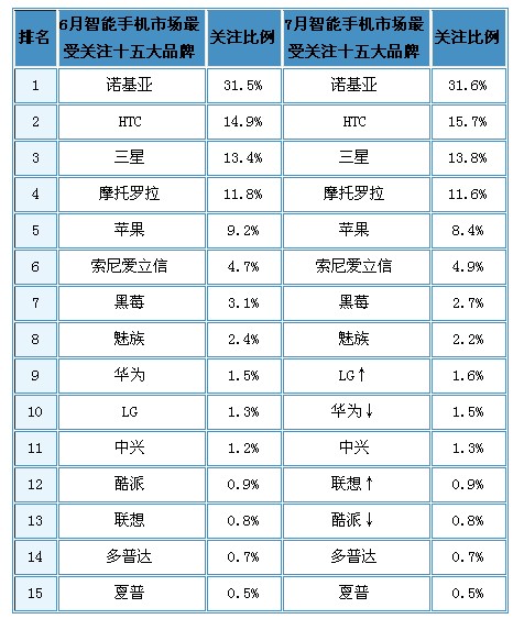 表 2011年6-7月中國智能手機市場品牌關注比例對比
