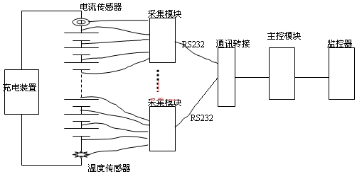 在電力系統(tǒng)變電站目前使用較多的蓄電池在線監(jiān)測裝置是電池巡檢儀,電池巡檢儀又分為兩種,一種是測量蓄電池單體電壓的巡檢儀,結(jié)構(gòu)是由一個主控模塊和數(shù)個采集模塊組成,主模塊接收監(jiān)控器的命令,發(fā)送電池?cái)?shù)據(jù)到直流設(shè)備的監(jiān)控器;采集模塊中每個模塊采集10~20節(jié)電池的電壓、電流和溫度;通過直流充電設(shè)備的監(jiān)控器可顯示各單節(jié)電池電壓,判斷故障電池的編號且給出報(bào)警。這類電池巡監(jiān)儀一般由直流設(shè)備生產(chǎn)廠家提供,在訂貨直流設(shè)備時(shí)它是選配裝置,由于功能單一、不能測試容量、且測量精度差、容易誤報(bào),限制了它的廣泛使用。測試示意圖如圖1: