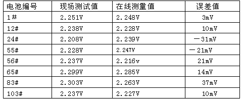 根據(jù)規(guī)程的要求,日常測量蓄電池端電壓采用是高精度4位半的數(shù)字萬用表,一般高精度萬用表蓄電池直流電壓檔測量精度為0.7%以上,絕大多數(shù)蓄電池在線裝置產(chǎn)品說明書上提到的測量精度達(dá)到了0.5%以上;顯示測量數(shù)值有些蓄電池在線裝置的測量端電壓數(shù)值為小數(shù)點(diǎn)后2位,與規(guī)程要求有較大誤差;有些裝置測量值雖可以到小數(shù)點(diǎn)后3位,但與實(shí)際用表測量數(shù)值相差較大。從運(yùn)行情況看,端電壓在線監(jiān)測的誤差是隨機(jī),每個數(shù)值偏差都不一致,而且偏差值隨著環(huán)境溫度、浮充電壓變化等而變化。表1為現(xiàn)場任意抽查幾個蓄電池浮充電壓,現(xiàn)場測試值與在線測量值的誤差情況,現(xiàn)場測試采用FLUK111數(shù)值萬用表直流檔測量精度0.7%,在線測量為許繼電源公司的WXJ-16型巡檢儀,測試環(huán)境溫度25℃。