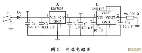不同芯片對(duì)供電電壓的要求也不同,本測(cè)試系統(tǒng)中,單片機(jī)P89LPC938所需的電壓為3.3 V,而電平轉(zhuǎn)換芯片MAX232所需要的電壓為5 V,因此,電源模塊的設(shè)計(jì)要滿足需求,設(shè)計(jì)時(shí)就需要兼顧兩者,外部只需提供12 V電壓即可。圖2給出電源電路的電路圖,本系統(tǒng)選用LM7805和LM1117兩個(gè)穩(wěn)壓器。