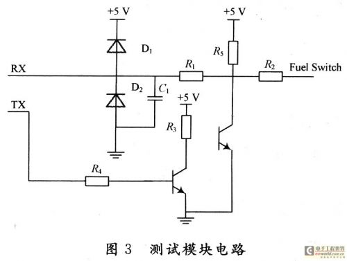 當(dāng)測(cè)試系統(tǒng)的TX端發(fā)送高電平時(shí),A點(diǎn)為高電平,燃料開關(guān)Fuel Switch信號(hào)線也將接收到高電平,同時(shí),測(cè)試系統(tǒng)的RX端也會(huì)接收到高電平。同理,當(dāng)測(cè)試系統(tǒng)的TX端發(fā)送低電平時(shí),燃料開關(guān)FuelSwitch信號(hào)線也將接收到低電平,同時(shí),測(cè)試系統(tǒng)的RX端也會(huì)接收到低電平。