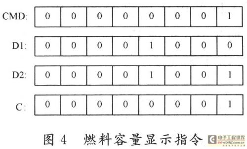 (2)單片機(jī)P89LPC938通過串口接收到“volume”命令,從指令集中提取相應(yīng)的指令信號(hào)。圖4給出單片機(jī)向燃料開關(guān)發(fā)出的一條燃料容量顯示指令。