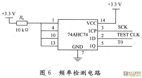 燃料開關(guān)是以數(shù)字通信方式與其他組件進(jìn)行協(xié)同工作的,異步通信的工作頻率則取自其中單片機(jī)的內(nèi)部時(shí)鐘,由于制造離散度及環(huán)境溫度等的影響,實(shí)際的工作頻率會(huì)發(fā)生漂移。為確保通信的可靠性,需要確認(rèn)燃料開關(guān)工作在適當(dāng)?shù)念l率范圍內(nèi),故需要對(duì)其實(shí)際的通信頻率檢測(cè)與確認(rèn)。要測(cè)試時(shí)鐘信號(hào)的頻率,可以通過測(cè)試一定區(qū)間內(nèi)脈沖的個(gè)數(shù)來實(shí)現(xiàn),測(cè)試時(shí)間越長(zhǎng),精度越高。本測(cè)試系統(tǒng)用D觸發(fā)器和單片機(jī)的計(jì)數(shù)、定時(shí)功能來完成此檢測(cè)。圖6即為此頻率檢測(cè)電路。