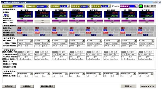 DTE對(duì)于參數(shù)的設(shè)置完全可以采用DTE專用的PC軟件來(lái)完成,全中文的DTE設(shè)置畫面簡(jiǎn)單明了。不動(dòng)區(qū)等參數(shù)需要結(jié)合現(xiàn)場(chǎng)實(shí)際工況來(lái)分析與設(shè)定。塑料擠出機(jī)一般可設(shè)置在:0.~2之間,而PID參數(shù)可以借助AT自動(dòng)完成。