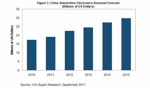 據(jù)IHS iSuppli公司的中國(guó)研究報(bào)告,2011年中國(guó)汽車電子市場(chǎng)銷售額預(yù)計(jì)將達(dá)到192億美元,比去年的175億美元增長(zhǎng)9.7%。