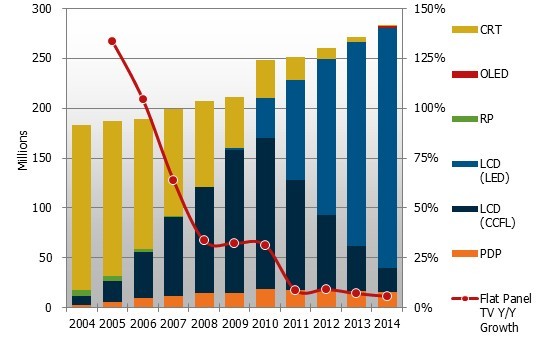 - 2004至2014年比較全球電視出貨與未來預(yù)測