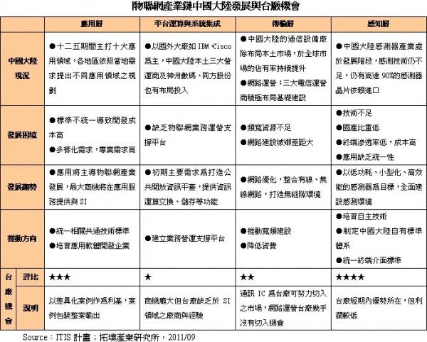 感知層一直以來都是臺廠之強(qiáng)項(xiàng),加上中國大陸目前技術(shù)較為薄弱,短期臺灣感測芯片廠具有較大之優(yōu)勢。應(yīng)用部分,智能電網(wǎng)與智能醫(yī)療在中國大陸將是最大的應(yīng)用領(lǐng)域與投資方向。但由于物聯(lián)網(wǎng)應(yīng)用范圍廣大,涉及各個層面,資源難以集中發(fā)展,臺廠可藉由差異化案例作為利基,將解決方案包裝后整案輸出。例如,臺灣目前推動的智能生活計畫,所積累的物聯(lián)網(wǎng)發(fā)展經(jīng)驗(yàn)及成熟技術(shù),如智能農(nóng)業(yè)、智能醫(yī)療、智能電表等,都是臺廠可藉力使力、搶攻物聯(lián)網(wǎng)應(yīng)用市場的機(jī)會。