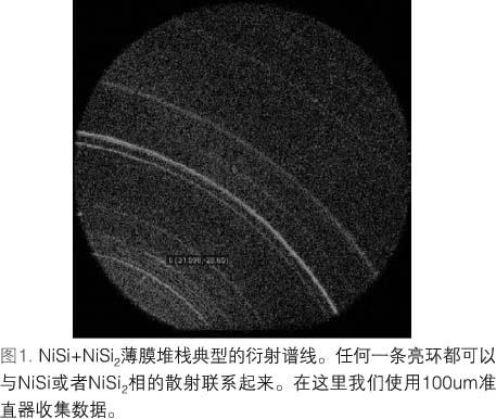 第一代應(yīng)用于多晶材料的XRD量測(cè)設(shè)備由HyperNex Inc和IBM共同研發(fā),并安裝在IBM位于紐約East Fishkill的半導(dǎo)體研發(fā)生產(chǎn)工廠。該設(shè)備的硬件設(shè)計(jì)極具針對(duì)性,它包括固定的放射源和探測(cè)器,可以在xy水平方向移動(dòng),在方位角方向旋轉(zhuǎn)的水平采樣載物臺(tái)。水平載物臺(tái)需要與硅片的傳送機(jī)械臂兼容,而xy傳送載物臺(tái)允許全硅片映射,它的重要性在隨后的章節(jié)中會(huì)變得顯而易見(jiàn)。X射線束使用可變的縫狀源,從而使得光束采樣可以覆蓋從50um到1mm的范圍。寬光束用來(lái)掃描無(wú)圖形的硅片,窄光束用來(lái)獲得有圖形硅片上獨(dú)立結(jié)構(gòu)的衍射譜線。描述獨(dú)立結(jié)構(gòu)特性的需求決定了系統(tǒng)必須具備視頻顯微鏡和圖形識(shí)別軟件。為了滿足高速產(chǎn)出的需要,二維場(chǎng)探測(cè)儀被用來(lái)收集衍射譜線。圖1說(shuō)明了一幅探測(cè)儀收集到的衍射譜線。將場(chǎng)探測(cè)儀收集的圖形組合起來(lái)便是傳統(tǒng)的衍射圖形(圖2),它可以用作相鑒定和多相薄膜中相數(shù)的量化,圖形中根據(jù)環(huán)強(qiáng)度的變化可以獲得該材料晶體織構(gòu)的信息,環(huán)的寬度決定了相關(guān)晶粒的大小。