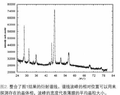 相分析要求事先了解感興趣的相。一種自動(dòng)化的峰擬合算法用來(lái)獲得曲線中每一個(gè)峰的位置和強(qiáng)度值。將實(shí)驗(yàn)峰值的位置與感興趣相的譜線作對(duì)比,來(lái)確定該相是否存在。另外,曲線中不能被匹配的峰意味著更多的相存在。例如在圖2中,如果取樣程式認(rèn)為在測(cè)量的硅片上只存在鎳單硅化物,盡管事實(shí)上相的鑒定需要手工完成,但多余的峰(來(lái)自于NiSi2)仍然會(huì)被軟件標(biāo)記。為了測(cè)量不同相的比例,一種針對(duì)多相系統(tǒng)的應(yīng)用遵循了這樣的原理,即一個(gè)獨(dú)立相衍射峰的強(qiáng)度(一級(jí)近似)與薄膜中對(duì)應(yīng)相的數(shù)量成比例。