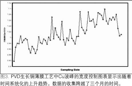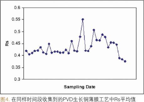 這種設(shè)備最初的一種應(yīng)用是監(jiān)測(cè)一系列物理氣相淀積(PVD)的反應(yīng)腔,這些反應(yīng)腔在銅互連金屬化制程中被用來(lái)淀積TaN/Ta/Cu襯墊層和籽晶層。這種監(jiān)測(cè)作為標(biāo)準(zhǔn)的平面電阻,膜厚量測(cè)的補(bǔ)充而存在。薄膜堆棧中Ta和Cu成分的織構(gòu)強(qiáng)度和譜線展寬數(shù)據(jù)都需要收集。TaN層具有無(wú)定形結(jié)構(gòu),因此無(wú)法監(jiān)測(cè)。圖3說(shuō)明了一個(gè)從銅元素峰寬控制圖表中輸出的例子。數(shù)據(jù)的趨勢(shì)穩(wěn)步向上,表明PVD銅籽晶的平均晶粒大小隨著時(shí)間在減小。圖4說(shuō)明了在相應(yīng)的Rs圖表中類似但并不十分顯著的增加。隨后的設(shè)備診斷發(fā)現(xiàn)受影響的反應(yīng)腔一個(gè)閥門(mén)有空氣泄漏的現(xiàn)象。泄漏影響到濺射工藝,進(jìn)而影響銅籽晶層的淀積,這一過(guò)程極有可能是在淀積和淀積之后的自退火過(guò)程中,由于銅在Ta表面的遷移率下降造成。更換了閥門(mén)之后,Rs和銅元素峰寬的值都變小,我們從圖3和圖4控制圖表中的最后三個(gè)數(shù)據(jù)點(diǎn)可以看出。