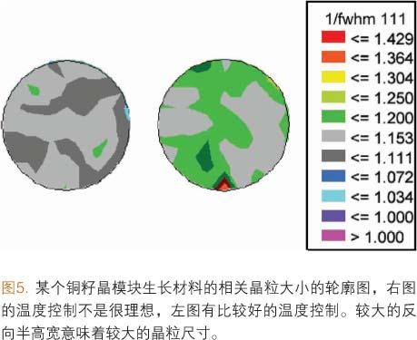 這里舉一個(gè)問(wèn)題診斷的例子,它是因?yàn)椴涣嫉臏囟瓤刂茖?dǎo)致某銅籽晶模塊生長(zhǎng)的材料晶粒尺寸產(chǎn)生偏移。通過(guò)對(duì)該模塊生長(zhǎng)的銅作日常的平板電阻和膜厚監(jiān)測(cè),并沒(méi)有發(fā)現(xiàn)任何異常,但線上的XRD系統(tǒng)顯示相關(guān)的晶粒尺寸有偏移(反向半高寬FWHM)。圖5說(shuō)明了某個(gè)銅籽晶模塊生長(zhǎng)材料的相關(guān)晶粒大小的輪廓圖,右圖的溫度控制不是很理想,左圖有比較好的溫度控制。較大的反向半高寬意味著較大的晶粒尺寸。