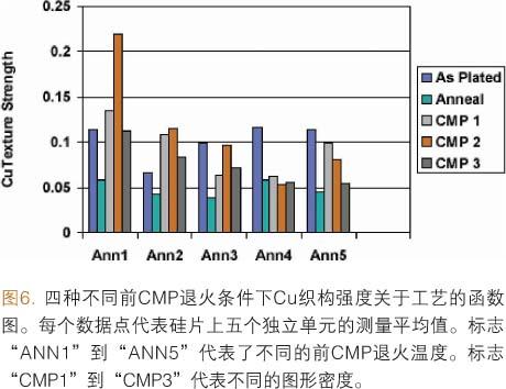 硅片在制程中的三個(gè)不同步驟進(jìn)行測(cè)量:電鍍之后,前CMP退火之后,金屬化之后。圖6說(shuō)明了在M1測(cè)得的銅織構(gòu)強(qiáng)度的結(jié)果。我們將最終結(jié)果作了平均,因?yàn)闆](méi)有觀察到銅微結(jié)構(gòu)在硅片中央和邊緣有任何不同。從數(shù)據(jù)中可以看出很多趨勢(shì),但應(yīng)該強(qiáng)調(diào)的是,微結(jié)構(gòu)的數(shù)據(jù)可以與其他線上量測(cè)的結(jié)果直接聯(lián)系起來(lái),特別是硅片的良率。所有的結(jié)果綜合起來(lái),可以選擇出該技術(shù)節(jié)點(diǎn)比較優(yōu)化的前CMP退火條件。