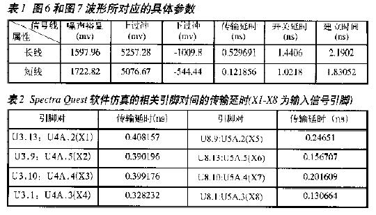 檢測器的每個信號應(yīng)盡可能保持同一傳輸延遲,這就要求布線時盡量保持長度一致,對于微弱的差別,可以根據(jù)仿真結(jié)果延長或縮短布線。完成布線以后,再利用Spectra Quest軟件仿真輸入信號的傳輸延遲,具體參數(shù)如表2所示。可以看出,其相對延時不超過0.2ns,仿真結(jié)果比較理想。