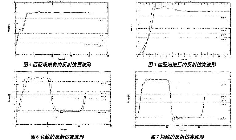 用頻率為50MHz,占空比為0.5的Pulse信號作觸發(fā),圖4和圖5分別為利用Signoise工具仿真得到的匹配端接前、后的仿真波形。從圖中可以看出,端接前,波形在上升沿有畸變發(fā)生,容易引起誤操作。匹配端接有效地消除了信號的畸變,單調(diào)性很好,而且在上升沿拉升了原信號,提前進(jìn)入電平切換,增加了信號的穩(wěn)態(tài)時間,信號的上升沿也比較平穩(wěn)。雖然在高電平的維持階段有上過沖,但對信號確認(rèn)沒有影響,信號質(zhì)量比較理想。另外,信號傳輸線長度對反射也有一定的影響。仿真發(fā)現(xiàn),傳輸線較長時,出現(xiàn)了預(yù)示的反射現(xiàn)象,如圖6所示;而傳輸線較短時,仿真波形和分析結(jié)果吻合得很好,如圖7所示。表1為上述兩種情況下的波形仿真參數(shù)。所以,布線長度不同,其處理方法也應(yīng)不同。一般來說,走線長度小于2英寸,以集總參數(shù)的LC電路來處理;大于8英寸,則以分布參數(shù)的傳輸線電路來對待。