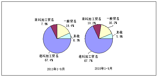 加工貿(mào)易出口比重下滑。1-9月,來、進(jìn)料加工貿(mào)易出口額分別為381和3241億美元,同比增長(zhǎng)-10.7%和13.9%,增速低于行業(yè)平均水平25.1和0.5個(gè)百分點(diǎn),加工貿(mào)易出口比重為75.4%,比去年同期下降2.5個(gè)百分點(diǎn)。9月份,來料加工出口下降21.0%,進(jìn)料加工出口增長(zhǎng)8.8%。