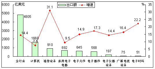 整機(jī)行業(yè)出口分化態(tài)勢(shì)明顯。1-9月,家電與計(jì)算機(jī)行業(yè)出口保持緩慢增長(zhǎng)態(tài)勢(shì),出口額分別為692和1668億美元,同比增長(zhǎng)9.5%和7.5%,增速低于全行業(yè)平均水平4.9和6.9個(gè)百分點(diǎn);通信設(shè)備行業(yè)出口保持較快增長(zhǎng),出口額910億美元,同比增長(zhǎng)31.1%,增速高于全行業(yè)平均水平16.7個(gè)百分點(diǎn)。與上半年相比,家電行業(yè)出口增速回落1.5個(gè)百分點(diǎn),計(jì)算機(jī)行業(yè)提高2.3個(gè)百分點(diǎn),通信設(shè)備行業(yè)回落4.5個(gè)百分點(diǎn)。