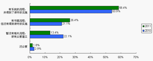供求雙方把伙伴關(guān)系建立在專業(yè)評(píng)估的基礎(chǔ)上,通過系統(tǒng)流程可以有效減少供應(yīng)商認(rèn)證和引入過程中的不合理操作、暗箱操作、防范采購風(fēng)險(xiǎn)、提高采購效率。在供應(yīng)商認(rèn)證與引入過程中,沒有建立和認(rèn)為沒必要建立系統(tǒng)流程的受訪者比例由2010調(diào)查的25%(22.1%+2.9%)降至2011調(diào)查的15.2%(13.4%+1.8%),已經(jīng)建立流程并且得到很好實(shí)施的比例也由2010調(diào)查的53.9%上升至2011調(diào)查的58.4%。