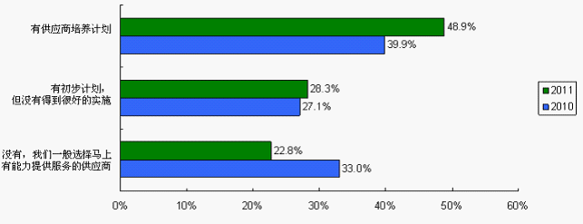 培養(yǎng)供應(yīng)商有利于建立供求雙方的伙伴關(guān)系,提高供應(yīng)商忠誠度,增強(qiáng)采購風(fēng)險(xiǎn)抵御能力。有供應(yīng)商培養(yǎng)計(jì)劃的系統(tǒng)廠商由2010調(diào)查的39.9%上升至2011調(diào)查的48.9%,而沒有計(jì)劃的由2010調(diào)查的33%降至22.8%。