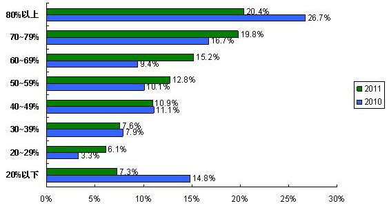 2011調(diào)查中國外品牌元器件占采購總額比例平均為58.6%,比2010調(diào)查的57.1%上升1.5%。采購國外品牌元器件占采購總額比例為70-79%、60-69%、50-59%三個(gè)區(qū)段的系統(tǒng)廠商占47.8%,是采購的主體,研發(fā)活動(dòng)活躍,這三個(gè)部分呈現(xiàn)出對(duì)國外品牌元器件需求的快速增長(zhǎng)。而采購國外品牌比例在80%以上和20%以下是采購的兩極,這兩極通過平衡采購比例來分散采購風(fēng)險(xiǎn),因此,這兩極的系統(tǒng)廠商數(shù)量比2010調(diào)查有顯著降低。雖然2010年的元器件缺貨給國產(chǎn)元器件進(jìn)入AVL(合格供應(yīng)商,Approved Vendor List)帶來機(jī)會(huì),但是該趨勢(shì)還未對(duì)電子元器件供應(yīng)鏈整體產(chǎn)生顯著影響。