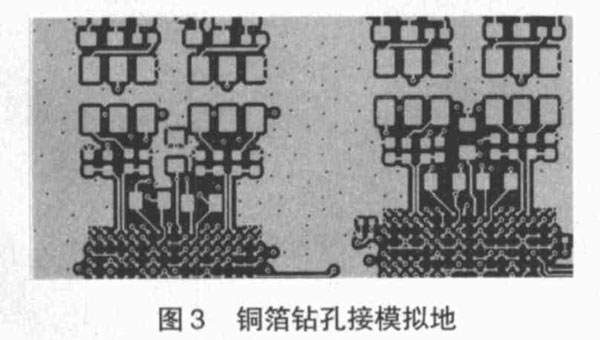 (5 )大面積覆銅箔接模擬地。在模擬電路部分覆大面積銅箔并在空白區(qū)域鉆密集的孔接到模擬地,這樣可以起到屏蔽隔離作用,從而減少模擬信號之間的相互干擾,而且還可以起到散熱作用。