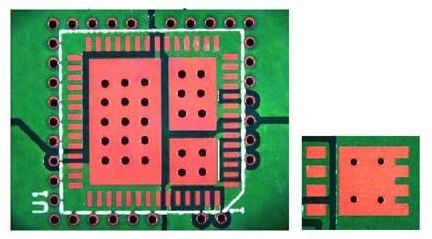 至于版圖布局,金屬較多顯然很有助益。更厚的頂層有助于降低溫度,不過也許對(duì)PCB的其余部分并不適合,因?yàn)槌杀驹黾恿?其它元件需要的更精細(xì)的間距也不可能實(shí)現(xiàn)。更大的銅面積很有用,但又會(huì)消耗PCB空間。這些應(yīng)該盡可能由焊料覆蓋,因?yàn)榻饘俦砻姹韧科岜砻娴纳嵝愿?。在多層PCB中,有時(shí)利用內(nèi)層來協(xié)助散熱。熱通孔 (填充焊料) 有時(shí)可用來把熱量擴(kuò)散到PCB的另一面去 (圖9)。