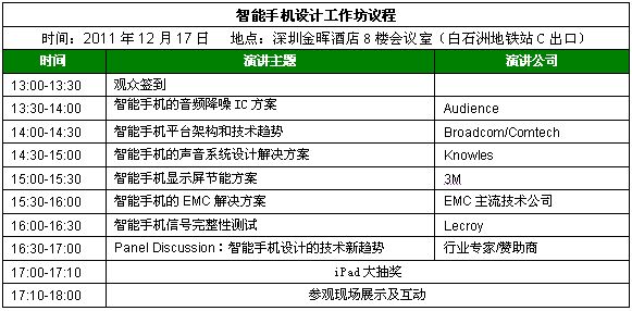 - 智能手機設(shè)計工作坊將于2011年12月17日下午在深圳金暉酒店召開