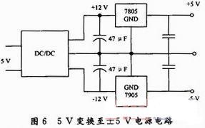 采用DC/DC定電壓隔離非穩(wěn)壓模塊A0512S-2W,將5 V單電源變換成±12 V,再利用穩(wěn)壓模塊變換成±5 V電源,給前兩級放大器供電。電路如圖6所示。類似地,用定電壓隔離模塊A0515S-2W,將5 V變換至±15 V電源為末級放大器供電。如圖6所示。