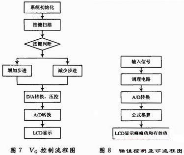 MSP430系列單片機是美國德州儀器(TI)1996年開始推向市場的一種16位超低功耗的混合處理器(Mixed Signal Processor)。由于它具有極低的功耗、豐富的片內(nèi)外設(shè)和方便靈活的開發(fā)手段,已成為眾多單片機系列中一顆耀眼的新星。對于MSP430系列而言,由于引進了FLASH型程序存儲器和JTAG技術(shù),不僅使開發(fā)工具變得簡便,而且價格也相對低廉,并且還可以實現(xiàn)在線編程。程序采用C語言開發(fā)。VCA810的VG控制以及輸出電壓幅值檢測、顯示的流程圖如圖7、圖8所示。