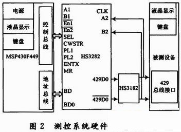 接口的實現(xiàn)方式選用Intersil公司的HS3282芯片,它支持ARINC429通信規(guī)范和其他串行數(shù)據(jù)傳輸協(xié)議,采用+5 V供電。具有兩路接收、一路發(fā)送的功能。通道接收器之間也是獨立的并行接收,可以直接連接到ARINC429總線,而不需電平轉換。使用時和HS3182總線驅動器配合,就可以發(fā)送數(shù)據(jù)進行二級差分驅動,產(chǎn)生ARINC429總線的電平。HS3282數(shù)據(jù)總線為16位,MSP430F449為16位單片機,從而避免了8位單片機為解決系統(tǒng)總線匹配的問題需要采用鎖存器作為虛擬總線的煩惱,提高了測控系統(tǒng)的可靠性。