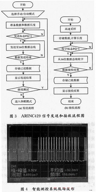 對此便攜式低功耗雷達導航儀智能測控系統(tǒng)的測試內容包括:發(fā)送數(shù)據(jù)、接收數(shù)據(jù)和發(fā)送數(shù)據(jù)間隔等測試。由于HS3282的兩路輸出是差分輸出的,所以只需要測試其中的一路就可以了。智能測控系統(tǒng)現(xiàn)場波形如圖4所示,發(fā)送的數(shù)據(jù)采用自動模式,控制字為奇校驗。通過示波器直接觀察HS3282芯片的輸出信號,輸出電平是3.92 V,滿足TTL的電平要求。而數(shù)據(jù)之間的時間間隔,即組間數(shù)據(jù)4位間隔。由單片機的延時程序即可完成。