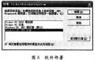 在Visual Studio 2003中進行軟件設(shè)計,并在模擬器中調(diào)試成功之后,就可以將軟件下載到實驗平臺中運行,在軟件進行部署前安裝ActiveSync 4.1,并在軟件進行部署時選中“Windows CE.NET、設(shè)備”見圖6。