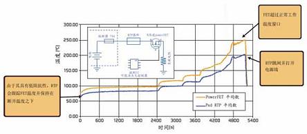 圖2. 在一次慢性熱失控情況下,RTP器件會跟蹤powerFET溫度,直到它在200°C時(shí)斷開電路。