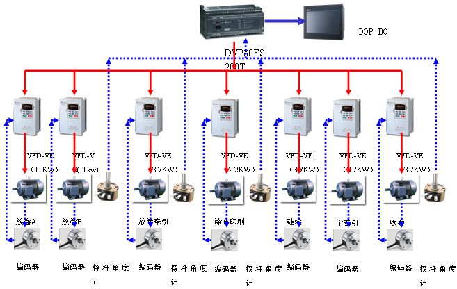 系統(tǒng)中所有變頻傳動軸均采用了編碼器反饋的閉環(huán)的矢量控制模式,之所以使用閉環(huán)矢量控制模式,是為了保證傳動軸的速度控制精度能夠更準(zhǔn)確、更快速、更穩(wěn)定,盡量避免電機(jī)的滑差所造成的不同速度的線速度線形關(guān)系。