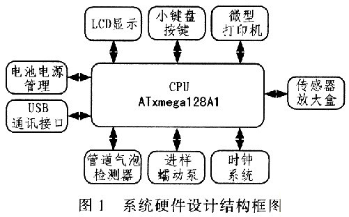 該系統(tǒng)是以ATxmegal28Al微處理器為核心,外圍連接有顯示、按鍵、打印機、傳感器放大盒、電源、通訊等模塊,其硬件設計結構框圖如圖1所示。