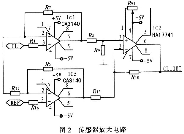 如圖2所示,采用3個運算放大器組成的測量放大電路,前段有2個高輸入阻抗的CA3140構成差動輸入。后端的HAl7741實際上是一差動跟隨器,其增益近似為1。為了保證放大器的精度,負反饋電阻選擇高精度低溫漂的精密電阻,且電路閉環(huán)增益不太大。同時為防止電路板表面的漏電流,對電路板進行了局部鏤空。為了能在野外惡劣環(huán)境下工作,對電路板還進行了防潮處理和電子屏蔽。