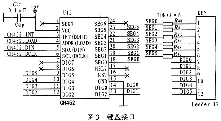 為便于用戶使用,該系統(tǒng)共36個按鍵,其中有26個英文字母按鍵、4個快速功能按鍵、4個方向按鍵以及確定和取消按鍵,這些按鍵制作成6x6的薄膜開關按鍵。所有按鍵均有CH452器件控制,這樣可降低主處理器的工作負擔,大大簡化了軟件編寫程序。CH452內置64鍵鍵盤控制器,基于8x8矩陣鍵盤掃描;內置按鍵狀態(tài)輸入的下拉電阻;內置去抖動電路;鍵盤中斷,可以選擇低電平有效輸出或者低電平脈沖輸出;提供按鍵釋放標志位,可供查詢按鍵按下與釋放;支持按鍵喚醒,處于低功耗節(jié)電狀態(tài)中的CH452可以被部分按鍵喚醒。