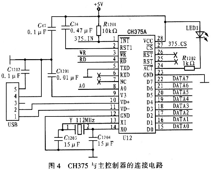 為便于儀器現(xiàn)場使用方便,該系統(tǒng)設計了對外信息輸送的USB接口,可使儀器便捷地與各類存儲器及電腦連接。其中,USB接口控制器采用CH357器件。CH357支持USB-HOST主機方式和USBDEVICE/SLAVE設備方式。在本地端CH375具有8位數(shù)據(jù)總線和讀、寫、片選控制線以及中斷輸出,可方便地掛接到ATxmegal28Al微控制器的系統(tǒng)總線上。圖4為CH375與主控制器的連接電路,CH375的TXD引腳直接接地,從而使CH375工作于并口方式。電容C1201用于CH375內部電源節(jié)點退耦,采用0.01μF的高頻瓷片電容,可提高接口的EMI要求。電容C47和C1202用于外部電源退耦,采用0.1μF的高頻瓷片電容。晶體X11、電容C1203和C1204用于CH375的時鐘振蕩電路。USB-HOST主機方式要求時鐘頻率比較準確,X11的頻率是12 MHz±0.4‰,C1203和C1204是容量約為15 pF的獨石電容。LEDl為數(shù)據(jù)傳送指示燈,用戶可以直觀觀察數(shù)據(jù)傳送狀態(tài)。