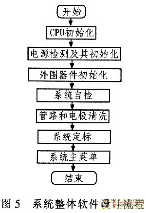 該系統(tǒng)軟件開發(fā)采用ATMEL公司提供的AVRStudio開發(fā)環(huán)境,并在該開發(fā)環(huán)境中內嵌了支持C語言的GCC。分析儀軟件全部采用C語言編寫,這樣開發(fā)周期縮短,維護便捷。該系統(tǒng)軟件設計采用層次化模塊化結構設計,共分為兩個層次,第l層是按照硬件各個功能模塊編寫相應的驅動和接口程序,包括液晶顯示、打印機、按鍵處理、步進電機、A/D采集轉換、系統(tǒng)時鐘、檢測和電源管理等模塊;第2層是在第1層的基礎上按照使用功能編寫的應用程序模塊,有主菜單、樣本分析、質控分析、質控統(tǒng)計、系統(tǒng)設定、系統(tǒng)校準、電極清洗、數(shù)據(jù)儲存及查詢和系統(tǒng)自檢等模塊。圖5中給出系統(tǒng)整體軟件設計流程。