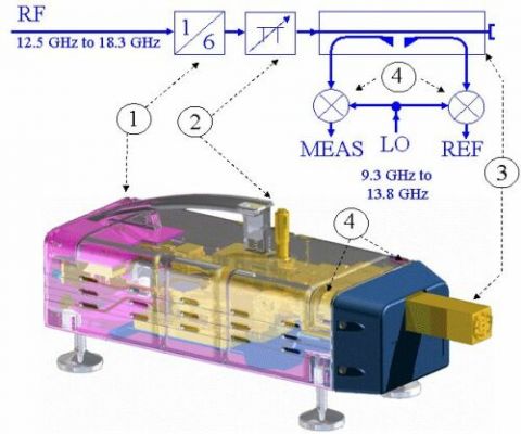 圖1顯示了R&S ZVA-Z110內(nèi)部的CAD結(jié)構(gòu)圖和原理框圖該變頻模塊包含用作隔離參考和測(cè)量信號(hào)的通道源倍頻器、可調(diào)節(jié)波導(dǎo)衰減器、定向耦合器這些參考和測(cè)量通道通過(guò)諧波混頻器進(jìn)行下變頻