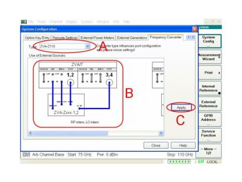 在圖2所示的A、B、C三個(gè)區(qū)域進(jìn)行如下測(cè)量配置:在A區(qū)擇變頻模塊型號(hào),在B區(qū)選擇電纜連接方式,在C區(qū)點(diǎn)擊應(yīng)用按鍵并連接變頻模塊到網(wǎng)絡(luò)分析儀(見(jiàn)圖 3),然后將頻率軸調(diào)節(jié)成75GHz到110GHz(見(jiàn)圖2底部)此外,變頻模塊的所有測(cè)量參數(shù)會(huì)被自動(dòng)設(shè)置(例如射頻和本振的倍頻系數(shù)、最佳功率電平、復(fù)位設(shè)置、連接類(lèi)型WR10,以及定義和選擇波導(dǎo)校準(zhǔn)套件R&S ZV-WR10)