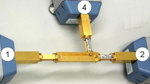 UOSM 校準(zhǔn)技術(shù)的優(yōu)點(diǎn)是可以利用一個(gè)未知的直通件作為標(biāo)準(zhǔn)件這一未知的直通件僅要求具有很好的正、反向互易性,因此,該未知直通件不要求具有良好的匹配和低損耗特性甚至價(jià)格低廉的、帶帶標(biāo)準(zhǔn)法蘭盤(pán)的波導(dǎo)管節(jié)、波導(dǎo)彎頭和波導(dǎo)扭轉(zhuǎn)接頭,只要具有互易特性都可以作為直通件在校準(zhǔn)后所有對(duì)輸出端口方向的改變都會(huì)造成(可避免的)精度損失,因此在這個(gè)例子當(dāng)中,一個(gè)H面的波導(dǎo)彎頭在波導(dǎo)測(cè)試端口1和4,以及測(cè)試端口2和4之間建立直通波導(dǎo)測(cè)試端口1和2是通過(guò)兩個(gè)測(cè)試端口的直接連接而建立直通的
