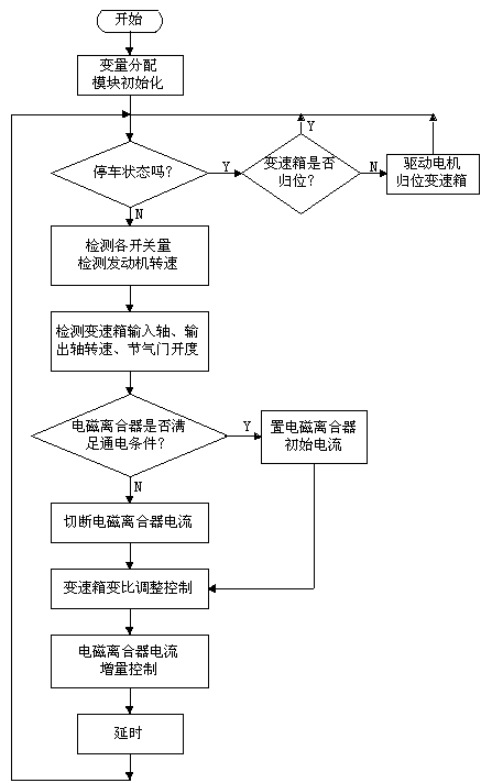 TCU控制系統(tǒng)主程序框圖如圖3所示。程序首先對內(nèi)部RAM進行分配,然后對各功能模塊如Administrator/D轉(zhuǎn)換器、定時器、PWM波形發(fā)生器等進行初始化。變速箱的變比在汽車每次時應處于最小變比的位置,因此在每次停車時應將變速箱歸位,汽車起動后首先檢測各參數(shù),如檔位開關、發(fā)動機轉(zhuǎn)速、節(jié)氣門開度、變速箱輸入、輸出軸轉(zhuǎn)速等。這些參數(shù)是控制電磁離合器電流和電動機狀態(tài)的依據(jù)。當需要增加變速箱的變比時,TCU控制電機正轉(zhuǎn),反之控制電機反轉(zhuǎn)。電磁離合器的控制采用電流增量控制方式。它的控制好壞,直接影響汽車運行的平穩(wěn)性和經(jīng)濟性。