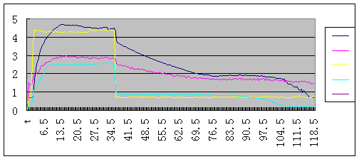 注:深藍—輸入軸轉(zhuǎn)速,黃—節(jié)氣門開度,紫紅—發(fā)動機轉(zhuǎn)速,淺藍—電磁離合器電流
