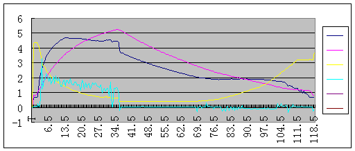 圖4和圖5為汽車實際運行時電磁離合器電流和變速箱變比的關系曲線。其中圖4為汽車速度從零急加速到120KM/H,到120KM/H后松開油門減速到零時的電磁離合器電流與發(fā)動機轉(zhuǎn)速、節(jié)氣門開度和輸入軸轉(zhuǎn)速之間的曲線圖。由圖可以看出節(jié)氣門急加到最大后保持一段時間,電磁離合器電流同步緊跟著加,當加到峰值時,繼續(xù)保持不變,發(fā)動機轉(zhuǎn)速也加到一個值保持不變,從圖中還可看出電磁離合器電流在增加的過程中,不斷在抖動,可知在上升過程中電磁離合器在不斷在打滑,在此段時間內(nèi)發(fā)動機轉(zhuǎn)速與輸入軸轉(zhuǎn)速不成比例,直到電磁離合器到一個穩(wěn)定的值后才保持一定的比例關系。當節(jié)氣門全松開后,電磁離合器電流隨之下降到一個小值后保持不變,直到車速達到使變速箱處于由齒輪變速為主時,電磁離合器電流繼續(xù)減小,當車速為零時,電磁離合器電流隨之減小到零。由圖4可知,當車速在從零加到120KM/H,電磁離合器電流為零,輸入軸轉(zhuǎn)速也慢慢減為零。在整個過程中,我們可看到,節(jié)氣門開度變化率代表了駕駛員的意圖,電磁離合器電流主要由節(jié)氣門開度來決定。電磁離合器的打滑程度決定了發(fā)動機轉(zhuǎn)速和輸入軸轉(zhuǎn)速的之間的傳輸比例關系。