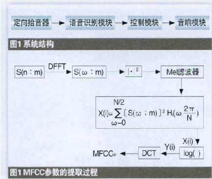 車(chē)載語(yǔ)音控制器系統(tǒng)由定向拾音器、語(yǔ)音識(shí)別模塊、控制模塊和音響模塊組成。系統(tǒng)的功能是:由拾音器采集駕駛員發(fā)出的語(yǔ)音命令,利用語(yǔ)音識(shí)別模塊將拾音器輸出的語(yǔ)音物理聲音信號(hào)轉(zhuǎn)變成語(yǔ)音數(shù)字信號(hào),并識(shí)別出語(yǔ)音命令對(duì)應(yīng)的漢字或詞語(yǔ),之后由控制模塊產(chǎn)生與之對(duì)應(yīng)的詞條編碼指令,通過(guò)系統(tǒng)I/O口線(xiàn)將控制命令傳達(dá)給音響,車(chē)載音響接收到控制指令產(chǎn)生動(dòng)作,響應(yīng)駕駛員的語(yǔ)音命令,比如快進(jìn)、快退或音量調(diào)節(jié)等。系統(tǒng)結(jié)構(gòu)及原理框圖如圖1 所示: